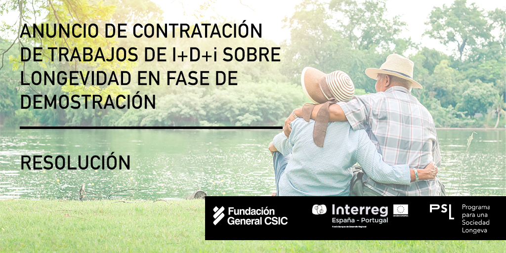 The Fundación General CSIC has resolved the contracting process for R&D&I work on longevity in the demonstration phase opened on 19 February 2020 within the framework of the Programme for a Longevity Society - PSL project (0551_PSL_6_E), part of the Interreg V-A Spain-Portugal Cooperation Programme (POCTEP) 2014-2020 financed by the European Regional Development Fund (ERDF).