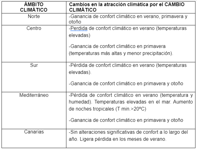 Tabla 2.-Cambios en la atracción climática por el cambio climático en España.