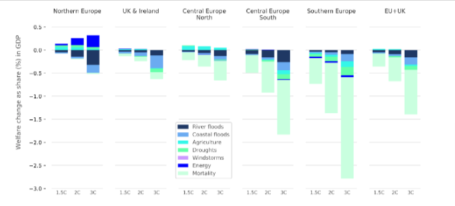 Y a ello se unirá la mayor frecuencia de aparición de eventos atmosféricos extremos (calor, frío, viento) que debe obligar, dentro de las medidas de adaptación a llevar a cabo por las administraciones, a adecuar los servicios sanitarios y de protección civil (avisos) a fin de minimizar sus efectos, especialmente en el grupo de población mayor en el sur de Europa. Este aspecto ha sido señalado por el informe “Peseta”, del Join Research Center del a Comisión Europea, que ha incluido, en la última versión (4ª edición) una proyección del impacto en el estado de bienestar de los países de la Unión Europea con horizonte 2100 para incrementos de temperatura media proyectados a 1,5º, 2 y 3º C a finales de siglo. Resulta señalado destacar que por vez primera se incluye proyección de subida térmica de hasta 3º C, umbral superior (2ºC) al establecido en el Acuerdo de París de 2014. (Feyen et al., 2020) (Figura 3 ).