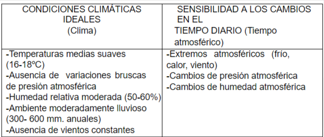Se puede afirmar que hay un clima confortable según la propia naturaleza de los seres humanos. Las personas mayores, por sus propias necesidades fisiológicas, demandan para su confort vital una serie de requisitos en materia climática y son, además, especialmente sensibles a los cambios en las condiciones atmosféricas diarias de un lugar. La tabla adjunta resume los condicionantes climáticos y atmosféricos de la atracción en el colectivo de población mayor