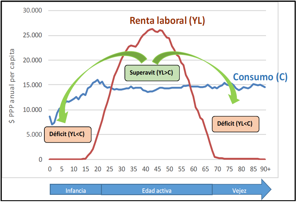 Representación esquemática del ciclo vital de las personas desde el punto de vista económico. Mientras el consumo a lo largo de la vida de una persona es siempre positivo, la capacidad para generar rentas del trabajo se limita a la edad activa, lo que provoca que existan necesariamente dos etapas de déficit de ciclo vital (al comienzo y al final), mientras que la edad activa se caracterizaría por un superávit. Por ello, deben existir mecanismos que permitan la redistribución de recursos, bien intertemporalmente (de cada individuo a sí mismo en las diferentes etapas) o bien intergeneracionalmente (de los activos a los niños y los mayores).