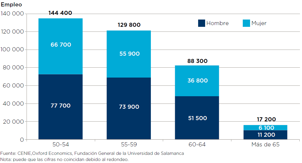 Según se desprende del estudio, los trabajadores mayores de 50 años llevan más tiempo en sus puestos de trabajo y empresas respecto a los grupos más jóvenes. Para todas las cohortes de más de 50 años, la mayoría de los trabajadores tiene más de diez años de experiencia en su puesto de trabajo, frente al 43% de los de 25 a 49 años. Esto puede ser un beneficio para estas empresas, ya que es probable que los trabajadores con más experiencia sean más eficientes en sus funciones.