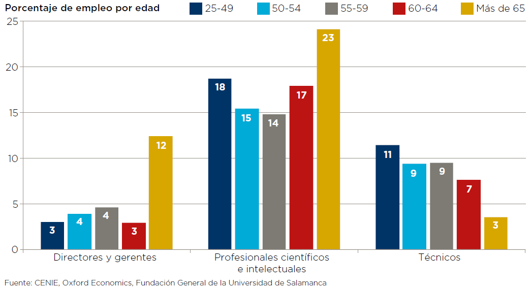 Al analizar el tipo de cualificación del empleo, se desprende de la investigación que los trabajadores mayores de 65 años en Castilla y León tienen más probabilidades de estar empleados en ocupaciones de alta cualificación; de hecho, “el 39% de la cohorte de más de 65 años estaban empleados en ocupaciones de alta cualificación, en comparación con el 32% de las personas de 25 a 49 años”. Esto se explicaría por los mayores niveles de conocimientos y experiencia que tendrían estos trabajadores de más edad, lo que justificaría los salarios medios más elevados de los trabajadores de más edad.