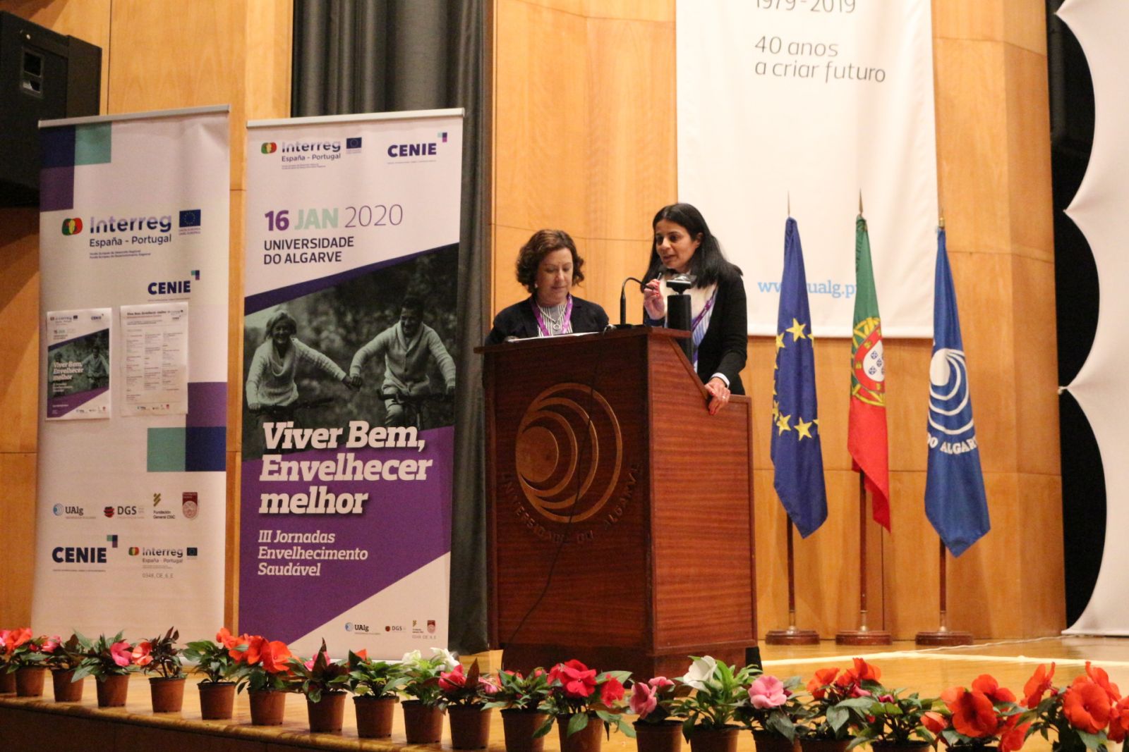 En el marco del Proyecto CENIE (0348_CIE_6_E) - Centro Internacional sobre el Envejecimiento, que forma parte del programa de cooperación INTERREG V A ESPAÑA-PORTUGAL (POCTEP) 2014-2020, el 16 de enero se celebraron las III Jornadas de Envejecimiento Saludable "Vivir bien, envejecer mejor", en el Gran Auditorio del Campus de Gambelas de la Universidad del Algarve, dirigidas al público en general, a los cuidadores informales y a los técnicos de la región.
