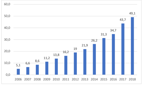 Evolución de usuarios de internet de entre 65-74 para el periodo 2006-2018, España.