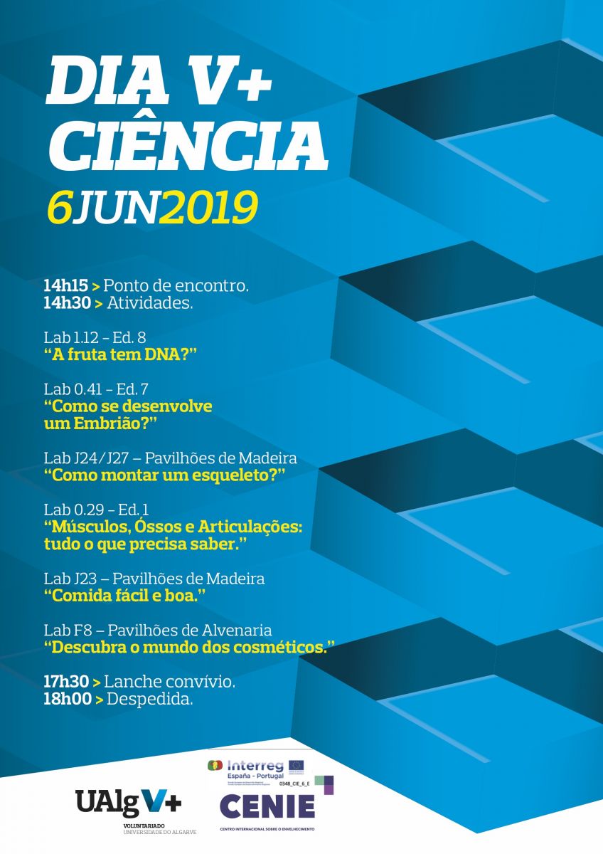 O Projeto CENIE – Centro Internacional para o Envelhecimento em Portugal organiza em parceria com o Grupo de Voluntariado da Universidade do Algarve - UAlg V+ o Dia da Ciência para Seniores. Durante esta tarde a Universidade do Algarve acolhe cerca de 60 seniores da região que vão poder conhecer os laboratórios da UAlg e do Centro de Investigação em Biomedicina (CBMR), nos quais terão a oportunidade de participar em vários workshops temáticos. O objetivo deste evento consiste a dar a conhecer à população sénior da região o que de melhor se faz em investigação e ciência na UAlg e por outro lado, promover o interesse e novas aprendizagens junto desta população.”