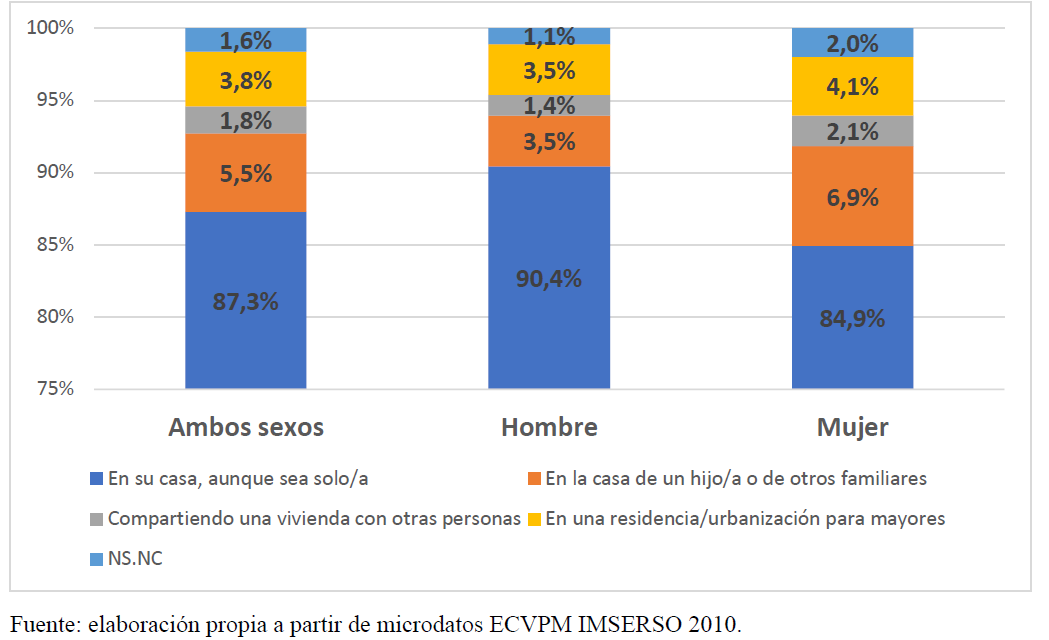 Embora os dados sejam um pouco antigos (quão valiosos e necessários são os inquéritos para conhecer a realidade), o Inquérito às Condições de Vida dos Idosos (2010) afirma que a maioria dos idosos quer viver na sua própria casa mesmo quando estão sozinhos: 87,27% da população com mais de 65 anos prefere, entre as opções, viver em casa. Viver com os filhos é a opção prioritária (apenas) para 5,5% dos idosos. É verdade que isso muda dependendo do sexo (a opção é maior entre as mulheres) e que a opção seria diferente no caso de problemas de dependência e da necessidade de cuidados para a vida diária, mas, como vimos, devemos deixar de assumir que a velhice e a dependência são sinónimos.