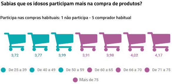 Pessoas com mais de 60 anos estão mais envolvidas nas compras de produtos do que pessoas menores a essa idade, especialmente as de mais de 75 anos, que o fazem muito mais do que pessoas entre 25 e 39 anos. No entanto, todas as faixas etárias geralmente fazem as suas compras num número muito similar de estabelecimentos, a média é de quase 3 estabelecimentos. As diferenças estão na maneira de chegar ao estabelecimento e no tempo que demoram. Enquanto 44,7% dos menores de 60 usam o carro para ir ao estabelecimento, tendo em média quase 12 minutos, 67,2% das pessoas com mais de 60 vão a pé, investindo cerca de 13 minutos. Essas diferenças são acentuadas à medida que as diferenças de idade aumentam, ao ponto de que 49% das pessoas entre 25 e 39 anos usam um veículo para levar algo menos de 11 minutos, enquanto 3 de 4 pessoas mais velhas de 75 preferem ir a pé, embora isso signifique investir 23 minutos, mais do dobro do que faixa etária acima mencionada.