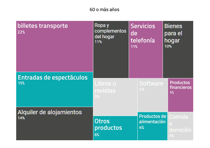 Qualquer tipo de produto ou serviço é adquirido em menor proporção à medida que aumenta a idade das pessoas que compram online. Esta diminuição segue uma tendência progressiva até chegar a um determinado nível de idade entre os 60 e 70 anos (dependendo do produto ou serviço), após o que a diminuição é mais acentuada. Por exemplo, enquanto cerca de 5 em cada 10 compradores com idades compreendidas entre 25 e 49 compra bilhetes de transporte, alugam alojamentos ou compram entradas para espectáculos, essa proporção é reduzida para 1 em cada 10 para compradores com mais de 70 anos de idade. Outros exemplos são produtos como vestuário e acessórios, bens para casa, revistas e livros ou serviços telefónicos que são adquiridos pela internet em aproximadamente 4 em cada 10 compradores entre 25 e 49 anos, enquanto apenas fazem isso cerca de 7% dos compradores com mais de 65 anos. Em contraste, em outros produtos como alimentos, software financeiro ou informático, a queda é mais suave e apenas os mais jovens compram entre o dobre e o triplo que os mais velhos. Em contraste, destaca-se que os compradores entre 25 e 39 anos pediram comida a domicílio quase 40 vezes mais do que aqueles com mais de 75 anos.