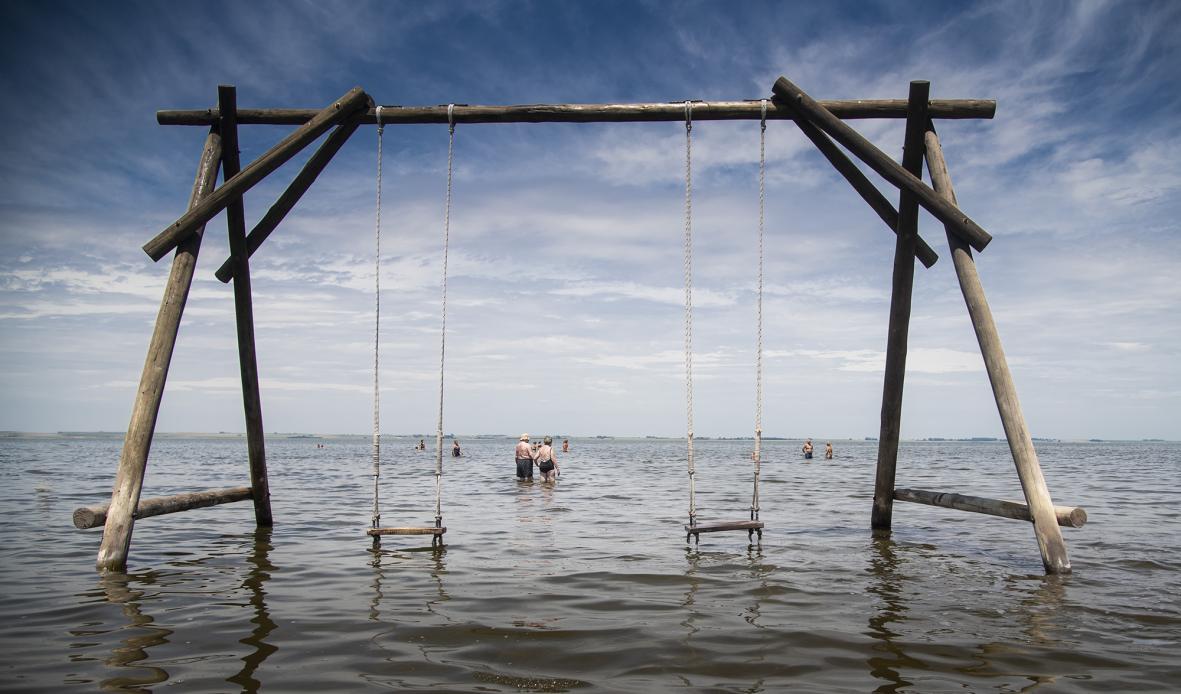 A simplicidade da imagem atrai-nos, centrando o nosso olhar em duas figuras que avançam no mar, lentamente, sem uma única onda e rodeadas de banhistas ao longe, com uma calma e uma quietude que nos enfeitiçam. Toda a cena é enquadrada por um grande baloiço de madeira, que nos centra e atrai, impedindo-nos de abandonar a história.