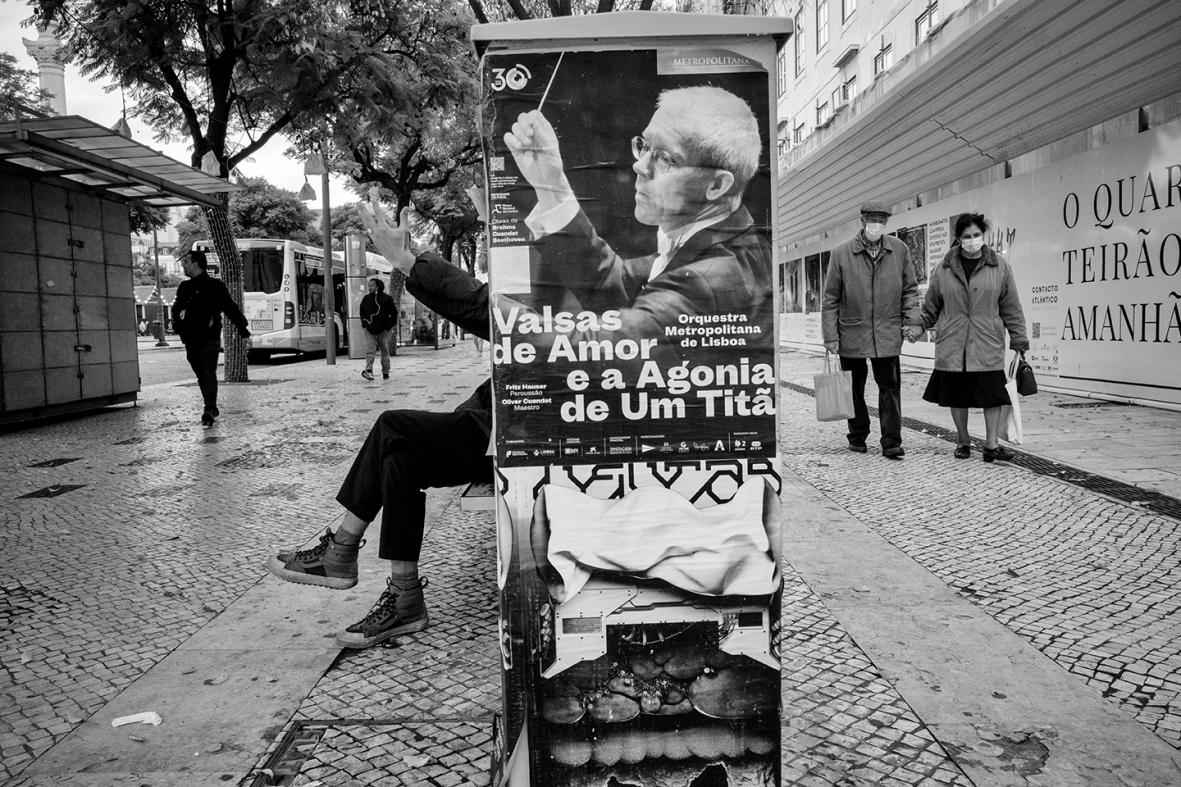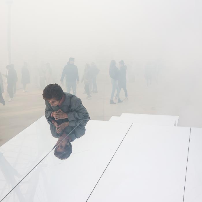 A luz branca inunda a imagem, destacando-se entre as pessoas ao longe, uma mulher inclinada com as mãos entrelaçadas. É ela com a sua imagem refletida no espelho, em completa solidão, encontrando-se a si mesma no nevoeiro. Uma imagem que transporta de silêncio, tranquilidade e calma.