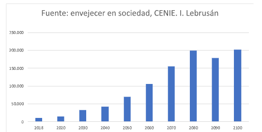 Gráfico: Projeções da porcentagem de pessoas com mais de 100 anos em relação à população total. Espanha, 2100.