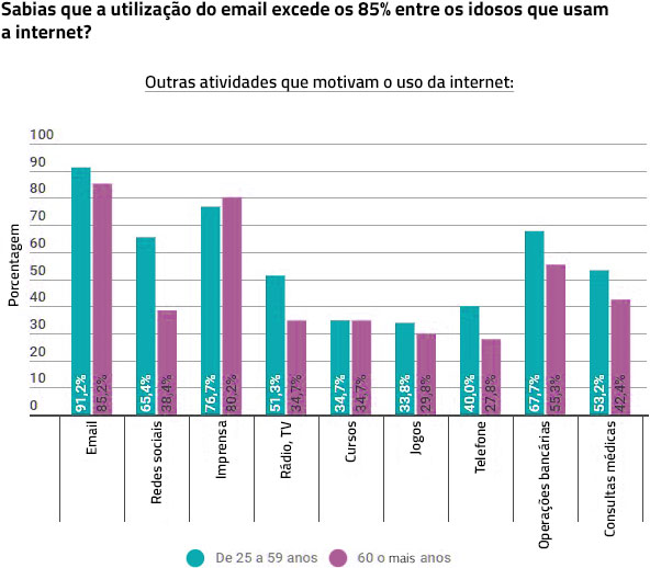 As duas atividades que mais motivam o acesso à Internet, qualquer que seja a idade, é consultar o email e ler a imprensa e as notícias. Exceto neste aspecto de usar a internet para ler a imprensa e notícias, no resto das atividades o seu uso é significativamente mais presente nos menores de 60 anos do que nas pessoas com mais de 60 anos. O uso da internet para atividades de natureza funcional (relacionamento com bancos , consultas médicas) apresenta valores elevados também para pessoas com mais de 60 anos (55% e 42%, respectivamente, daqueles que usam a internet), o que implica uma importante abertura para mudar ou complementar o canal físico com o eletrónico. Se os bancos conseguiram obter 55% dos clientes com mais de 60 anos usando a internet para operar através deste canal, as organizações médicas públicas e privadas, por analogia, têm uma margem para aumentar ainda mais a sua relação através do canal eletrónico a partir dos atuais 42%. Onde se podem ver as maiores diferenças entre os valores alcançados por aqueles com menos de 60 anos em relação aos que têm mais, é participar de redes sociais e seguir cursos de treinamento.